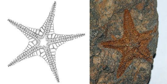 Vlevo: Siluraster perfectus Jaekel, 1903 - rekonstrukce, vpravo Siluraster cf. perfectus z naleziště El Kayd Errami, region Rissani, Maroko.
