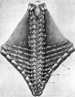 Předpokládaná podoba druhu Eospondylus cf. primigenius (Stürtz, 1886) †.